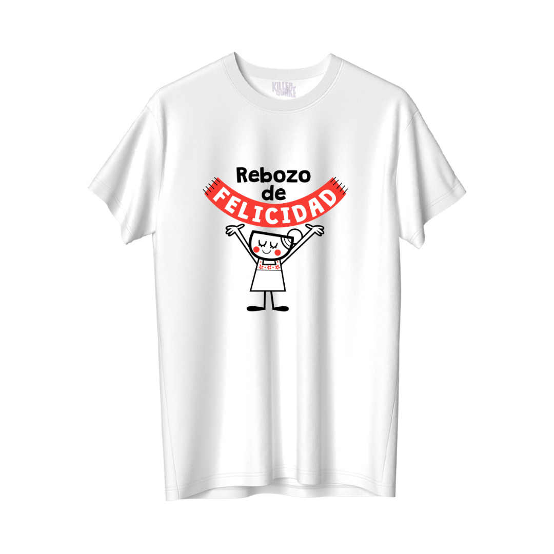 ¡La felicidad se lleva puesta, y esta playera es la prueba! ✨ Envuelve tu día con la calidez y la vibra positiva del "Rebozo de Felicidad" de Killer Quake. Inspirada en nuestra icónica prenda tradicional, esta playera es un lienzo de alegría y orgullo.